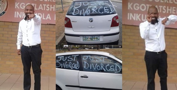 In some photos which surfaced online, the excited man is seen standing next to a Polo vehicle with the inscription ”just divorced’‘ written boldly on the back and side window of the vehicle