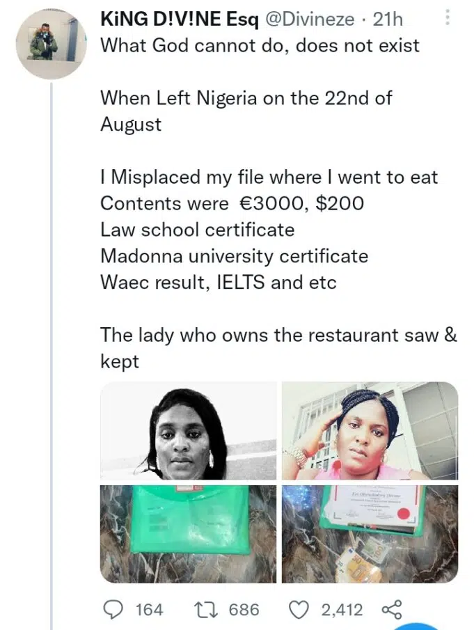 “What God cannot do, does not exist. When Left Nigeria on the 22nd of August. I Misplaced my file where I went to eat. Contents were €3000, $200 , Law school certificate, Madonna university certificate, Waec result, IELTS and etc. The lady who owns the restaurant saw & kept”, he wrote on Twitter.