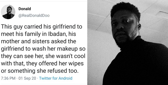 A Twitter user with the handle @RealDonaldDoo has sparked a debate on the platform after he claimed that a woman was asked by her prospective in-law to wipe her makeup when her boyfriend took her to meet them for the first time.