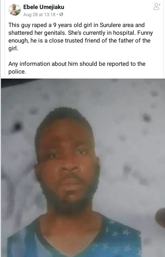 “This guy raped a 9 years old girl in Surulere area and shattered her genitals. She’s currently in hospital. Funny enough, he is a close trusted friend of the father of the girl.