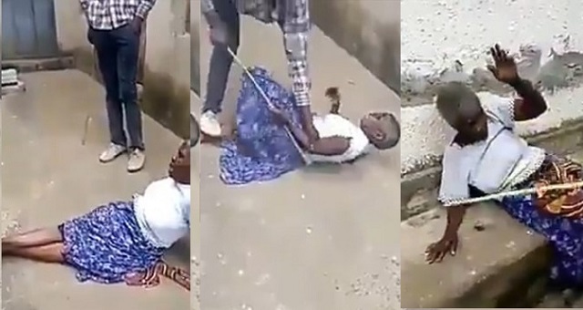 The man was seen manhandling his grand mother and flogging her without mercy.
