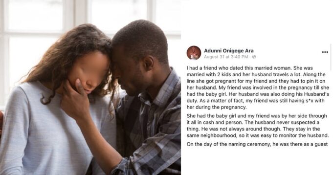 According to the Facebook user identified as Adunni, the man travels a lot, so his wife got involved with another man in his absence, got pregnant, and then succeeded in passing off the pregnancy as her husband’s.