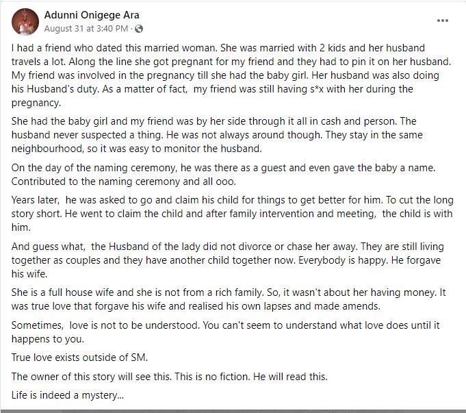 A Facebook user has narrated how a man forgave his wife after discovering that she had an extramarital affair and had a child for her lover.