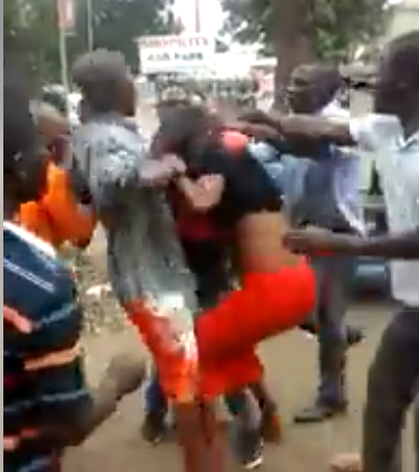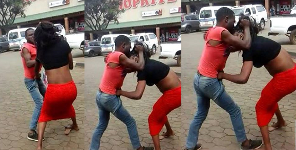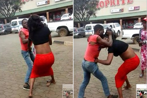 The lady then, attacked the man right there in front of the supermarket as two of them fought brutally to the shock of onlookers.