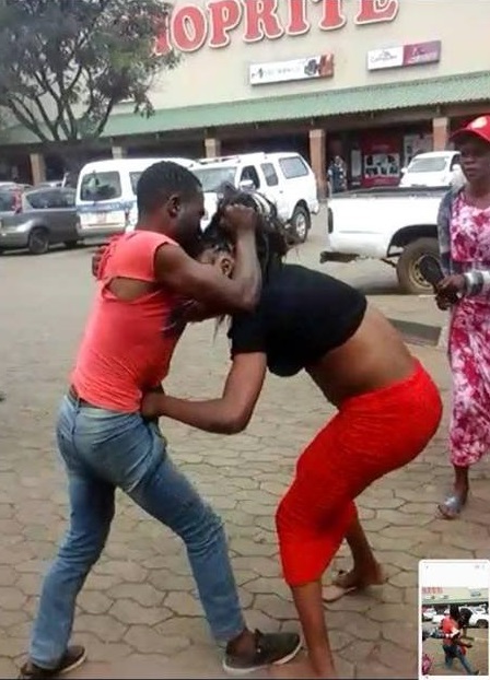 An embarrasing scene was captured on camera recently, after a man and a woman were pictured fighting outside a Shoprite Mall at an undisclosed Location.