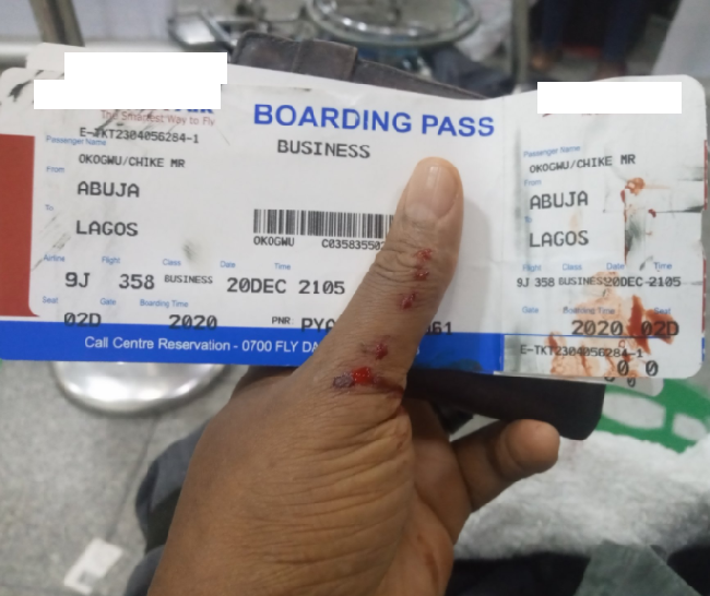 Sharing a photo of his bleeding hand and blood on his boarding pass, he wrote,