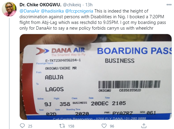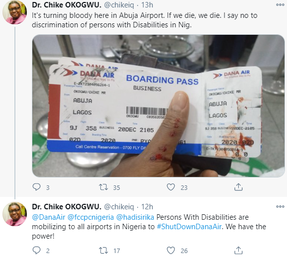 “This is indeed the height of discrimination against persons with Disabilities in Nig. I booked a 7:20PM flight from Abj-Lag which was reschdld to 9.05PM. I got my boarding pass only for DanaAir to say a new policy forbids carryn us with wheelchair”.