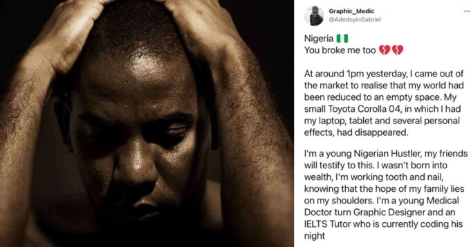 Adedoyin while sharing his story, revealed how he’s been left heartbroken over the grand theft auto. He says the car was stolen alongside other valuables such as his laptop and tablet that were inside the vehicle.