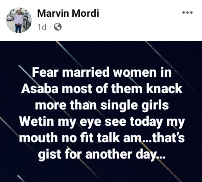 “Fear married women in Asaba most of them knack more than single girls Wetin my eye see today my mouth no fit talk am…that’s gist for another day,” he wrote.