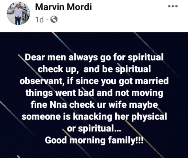 He added in a follow-up post, “Dear men always go for spiritual check up, and be spiritual observant, if since you got married things went bad and not moving fine Nna check ur wife maybe someone is knacking her physical or spiritual…Good morning family!!!”