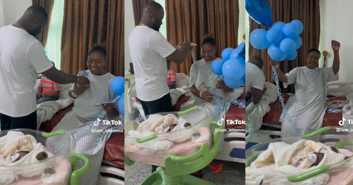In the video, the father went to the maternity ward with their young son and a slew of flying balloons to see his wife.