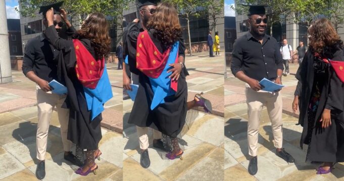 The video capturing a celebratory moment reveals the lady hailing her husband as she places her graduation cap on his head.