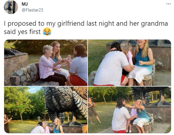 He wrote; ”I proposed to my girlfriend last night and her grandma said yes first”
