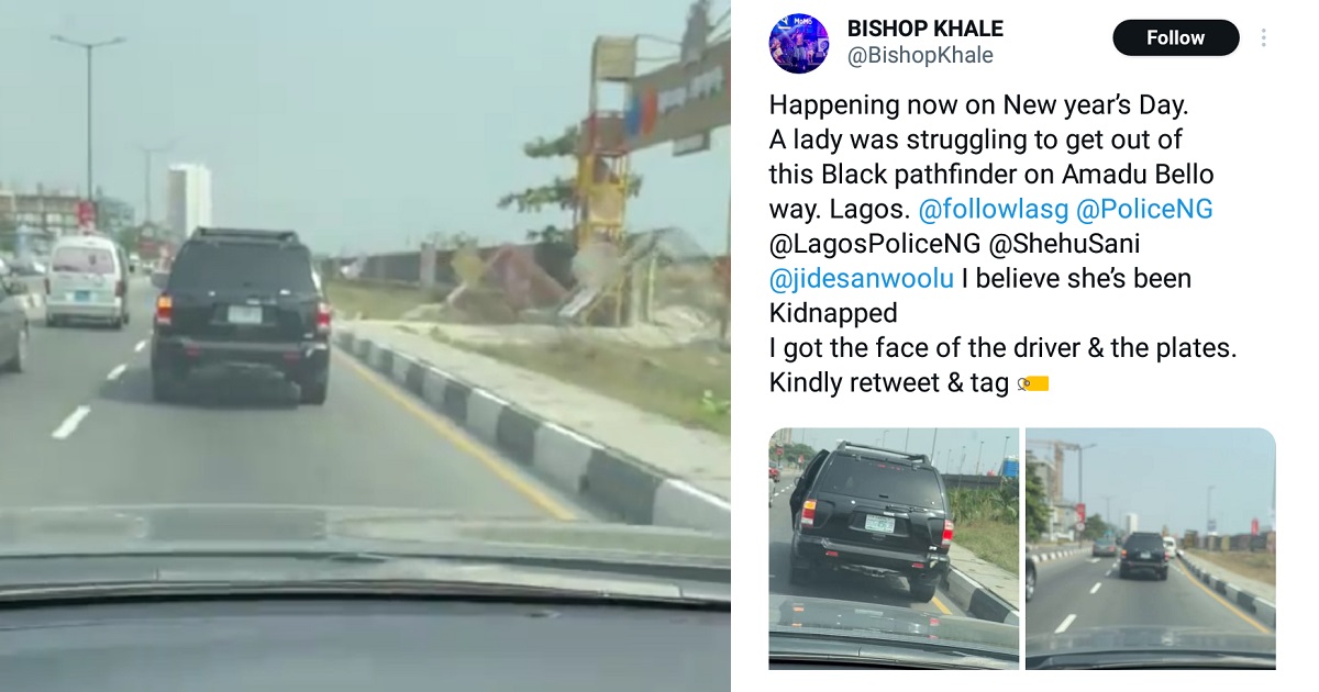 In a series of videos posted on X, the concerned individual, One bishop khale captured a distressing scene where a woman appeared to be struggling to free herself from a black Pathfinder car on Ahmadu Bello Way.