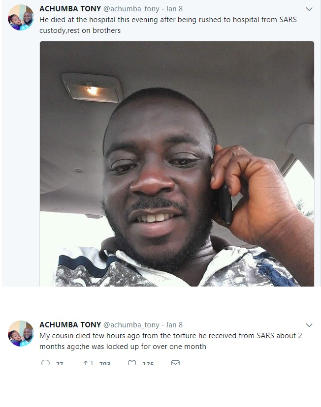 My cousin died few hours ago from the torture he received from SARS about 2 months ago;he was locked up for over one month