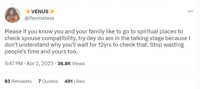 Please if you know you and your family like to go to spiritual places to check spouse compatibility, try dey do am in the talking stage because I don’t understand why you’ll wait for 12yrs to check that. Stop wasting people’s time and yours too.”
