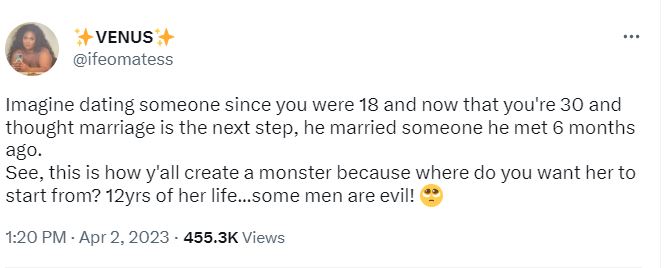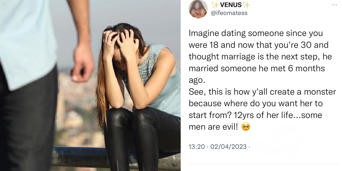 “Imagine dating someone since you were 18 and now that you’re 30 and thought marriage is the next step, he married someone he met 6 months ago. See, this is how y’all create a monster because where do you want her to start from? 12yrs of her life…some men are evil! 🥺.