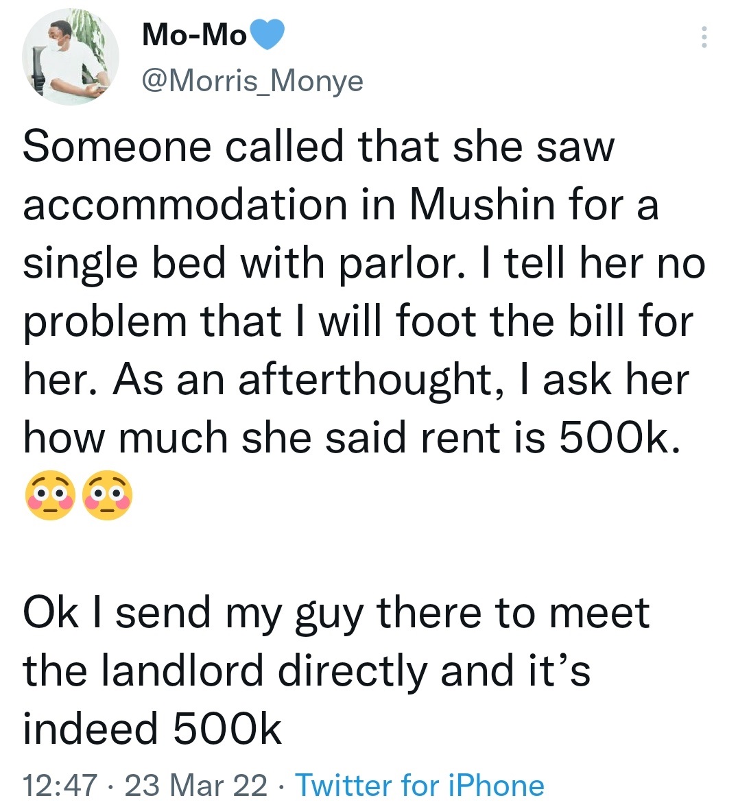 @Morris_monye took to Twitter to make this disclosure as he called on the Lagos state Government to regulate the cost of rent in the metropolitan city.
