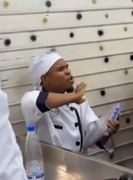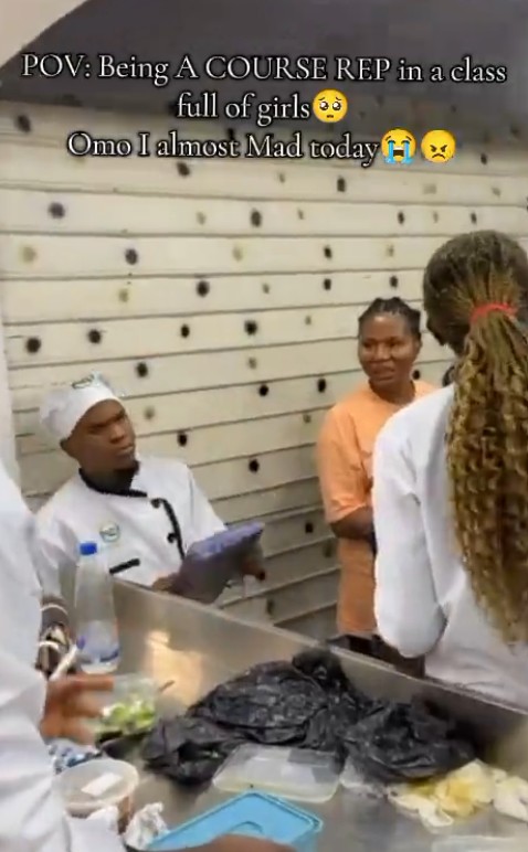 He could be seen in a stressful situation while directing and instructing his coursemates during their practical in the kitchen. His expression during the class revealed it wasn’t an ordinary task heading a class full of ladies, as it could be challenging attending to their different needs.