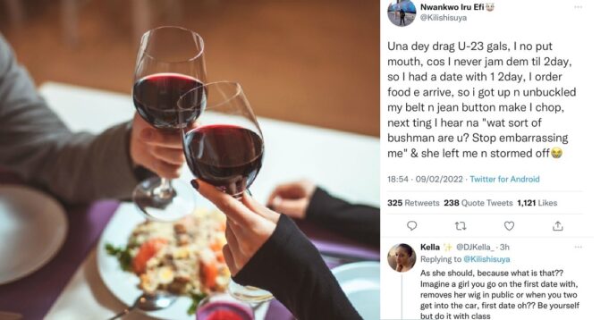 The man with Twitter handle @Kilishisuya, said the date didn’t go well, as the girl became infuriated and stated that he was embarrassing her after he stood up to unbuckle his belt and jean button to eat after their meal arrived.