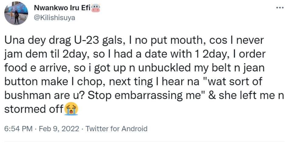 “Una dey drag U-23 gals, I no put mouth, cos I never jam dem til 2day, so I had a date with 1 2day, I order food e arrive, so i got up n unbuckled my belt n jean button make I chop, next ting I hear na “wat sort of bushman are u? Stop embarrassing me” & she left me n stormed off”, He tweeted.