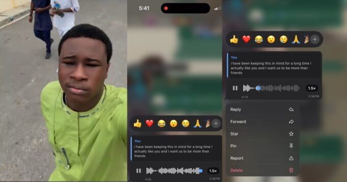 According to a voice note he posted online, after confessing his feelings, his “homegirl” sent back a voice note laughing hysterically.