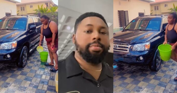 To impress him, the woman was shown on camera performing a man’s duty by washing her husband’s car at home rather than letting him go to the car wash.