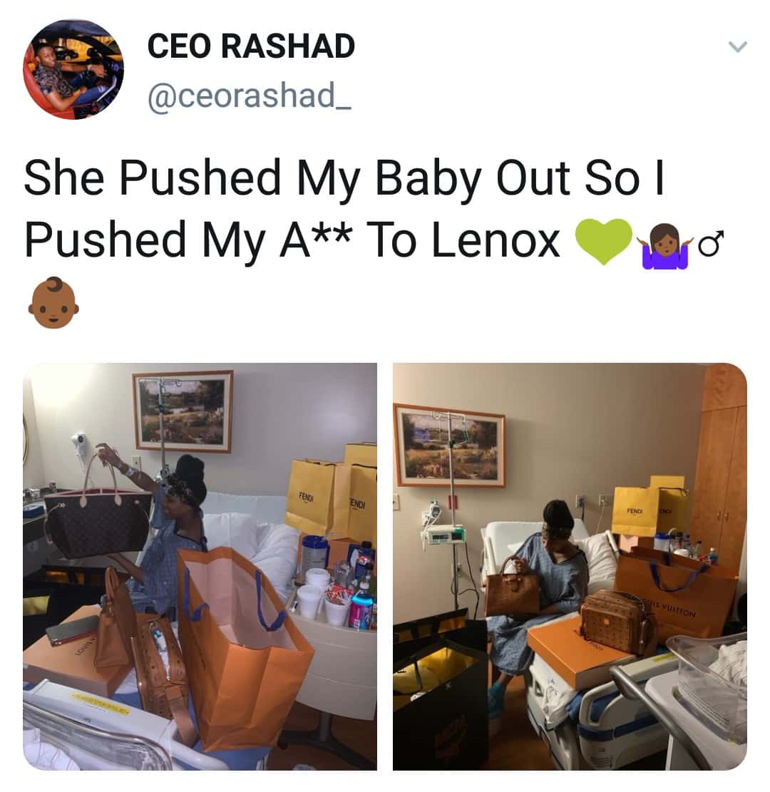 “She pushed my baby out so I pushed my a** to Lenox”.