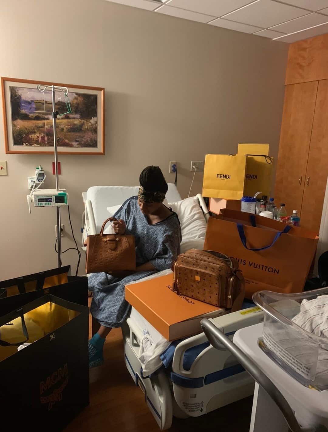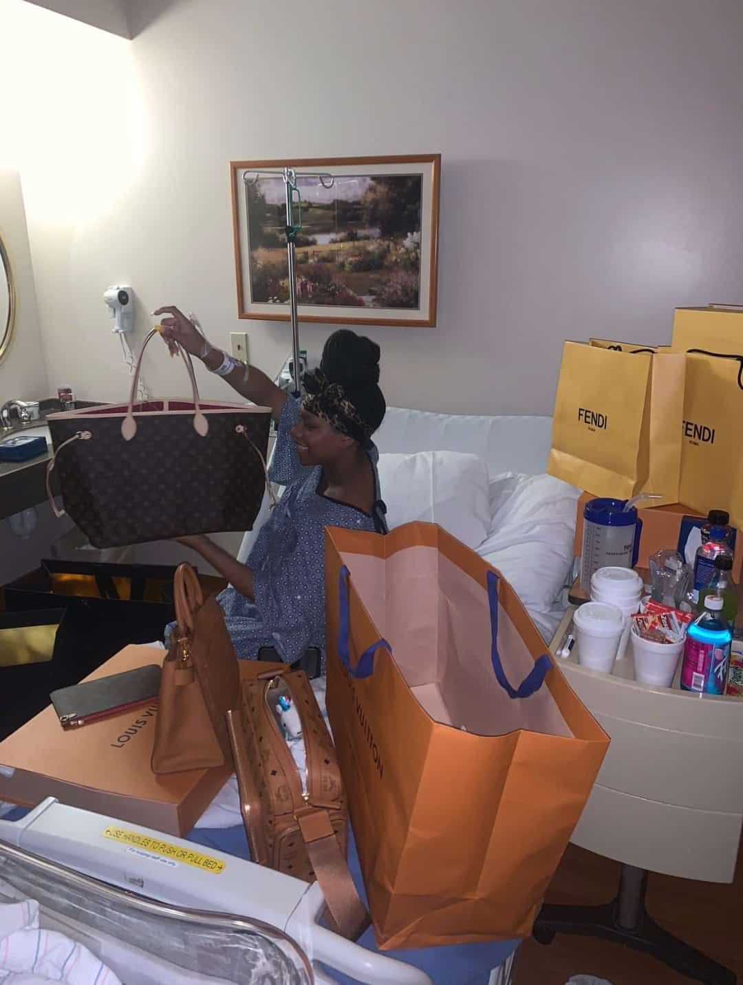 From the photos which he shared, the lady could be seen in her hospital bed with bags of expensive goodies surrounding her.