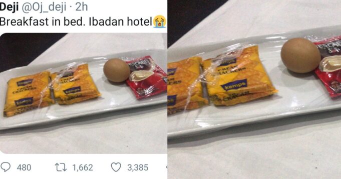 The Twitter user identified as @oj_deji on the platform, stirred reactions after he shared a photo of the breakfast which he claimed he was served at a hotel in Ibadan.