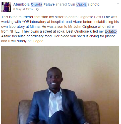 It was learnt that Ajuola , a student of Science Education , was allegedly stabbed to death at about 11pm on Monday at her off -campus residence.