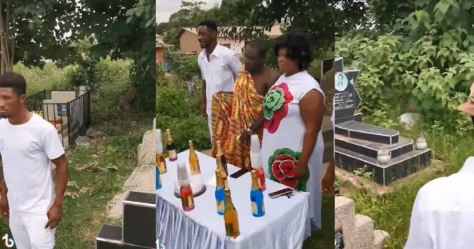The man identified as Nkrumah Samuel, popularly known as Remes Kay, who is an Actor and movie producer by profession, was seen donned in their traditional Kente attire alongside his friends as they celebrated in a cemetery.