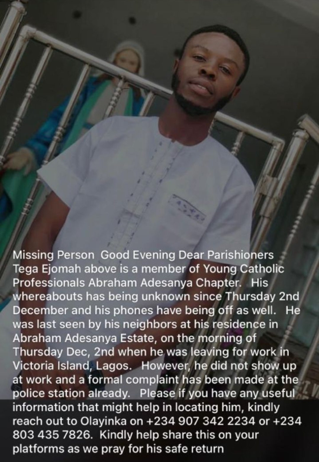 According to reports, his last known location was his residence at Abraham Adesanya Estate when he was seen leaving for work by his neighbors.