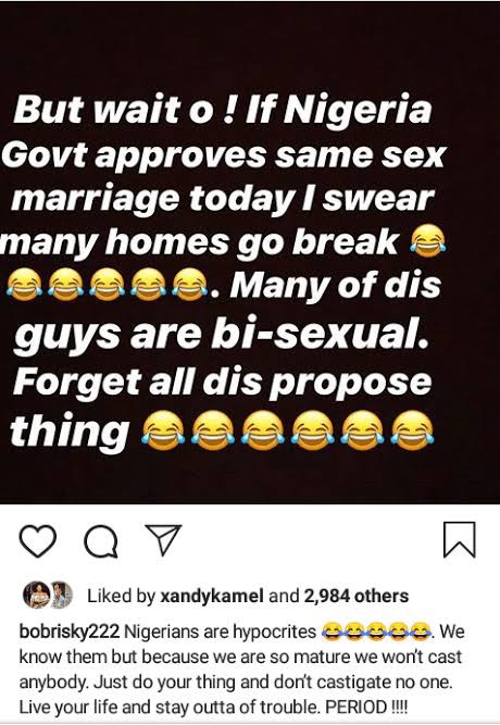 ”Nigerians are hypocrites ?????. We know them but because we are so mature we won’t cast anybody. Just do your thing and don’t castigate any one. Live your life and stay outta of trouble. PERIOD !!!!”