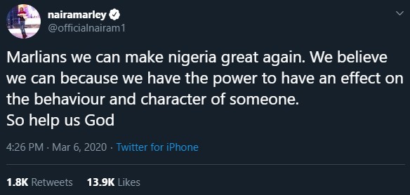 Taking to his newly verified Twitter account, Naira Marley wrote: “Marlians we can make nigeria great again. We believe we can because we have the power to have an effect on the behaviour and character of someone. So help us God.”