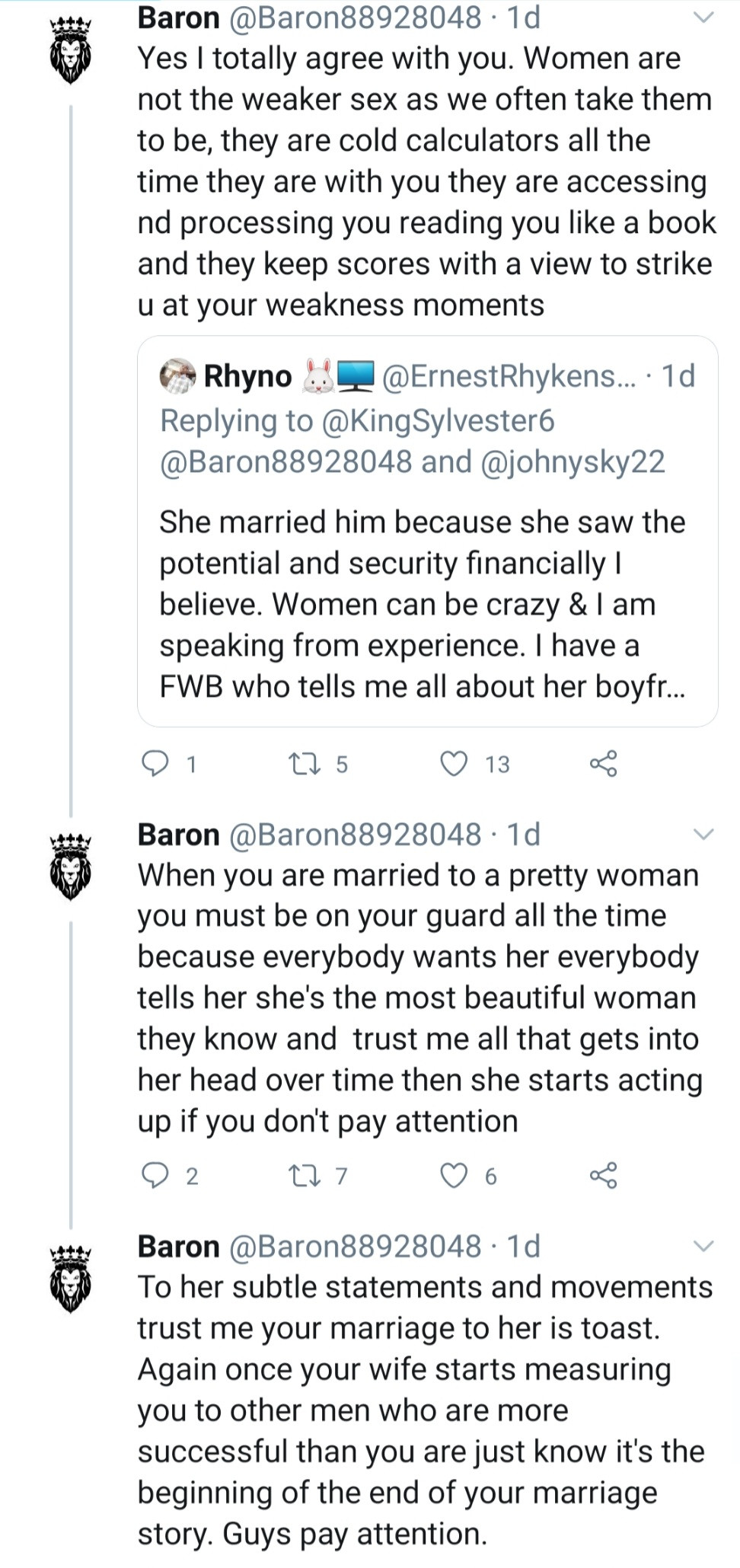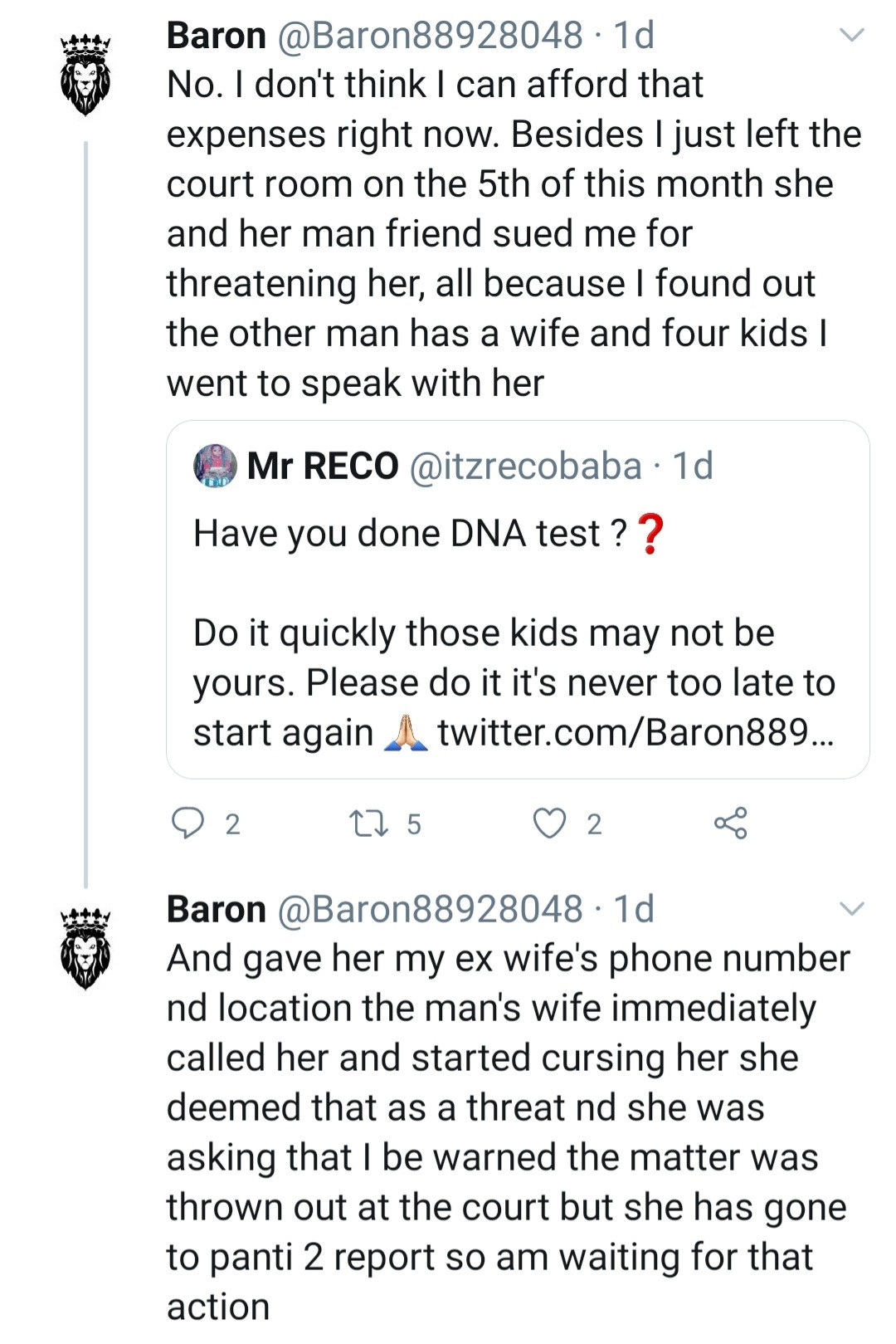 In a series of Twitter threads, the man narrated how he caught his wife, with whom he has four children, cheating on him with this other man. According to him, he left his marriage, and shortly after his wife and the man tied the knot.
