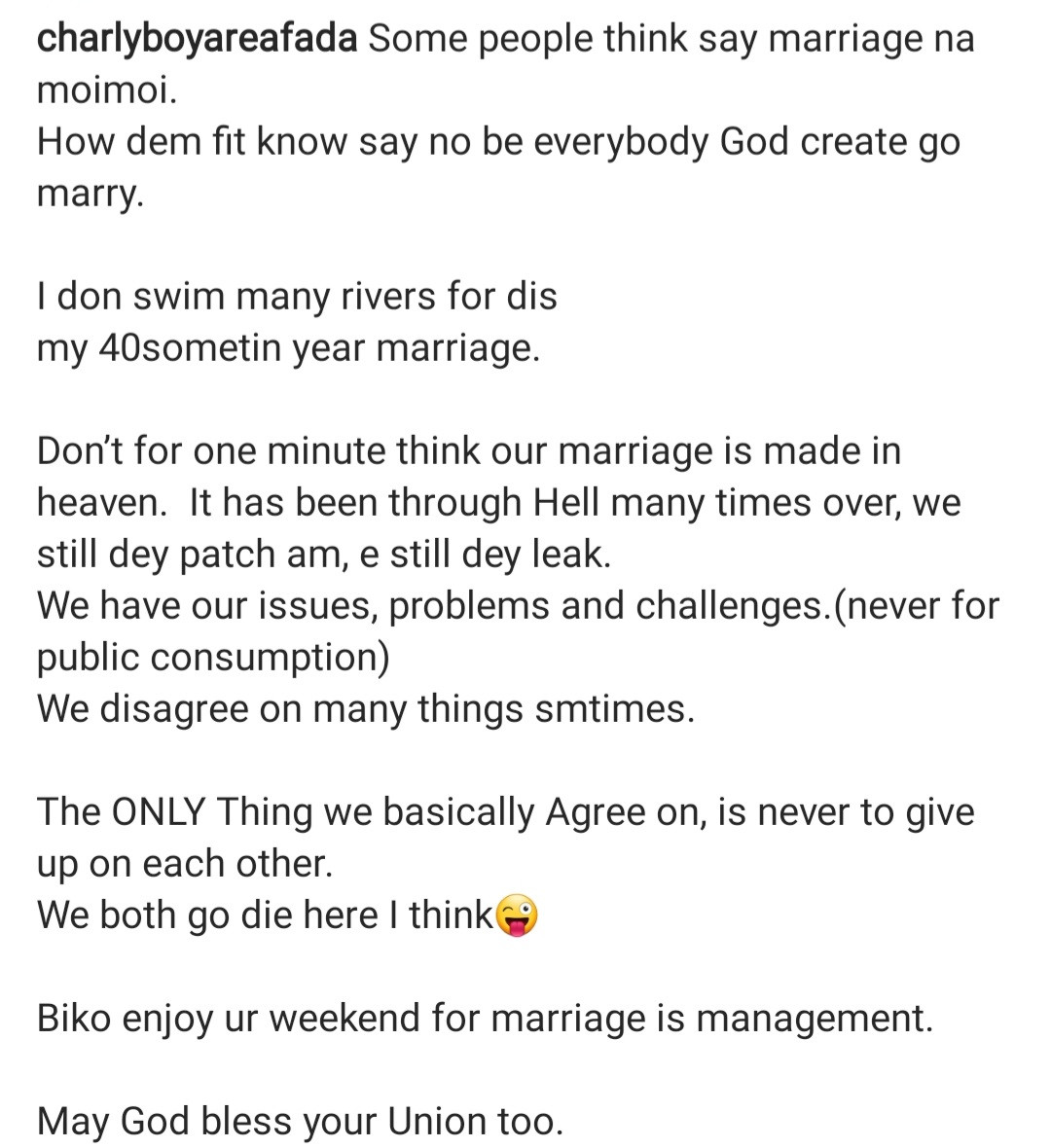 “Don’t for one minute think our marriage is made in heaven. It has been through Hell many times over, we still dey patch am, e still dey leak. We have our issues, problems, and challenges.(never for public consumption) We disagree on many things sometimes.