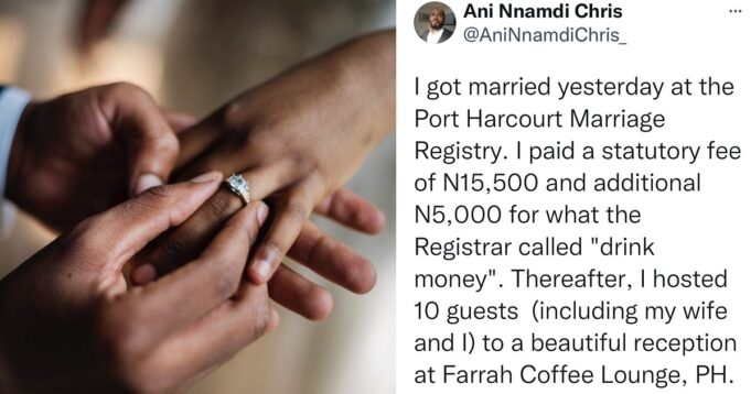 I got married yesterday at the Port Harcourt Marriage Registry. I paid a statutory fee of N15,500 and additional N5,000 for what the Registrar called “drink money”. Thereafter, I hosted 10 guests (including my wife and I) to a beautiful reception at Farrah Coffee Lounge, PH.