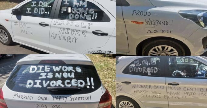 The man whose divorce was finalised on Monday, April 12th, defaced his car with several inscriptions to announce the end of his marriage.