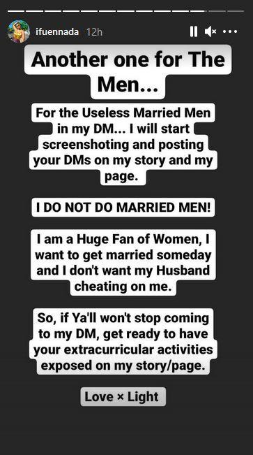 “Another one for The Men… For the Useless Married Men in my DM… I will start screenshooting and posting your DMs on my story and my page.