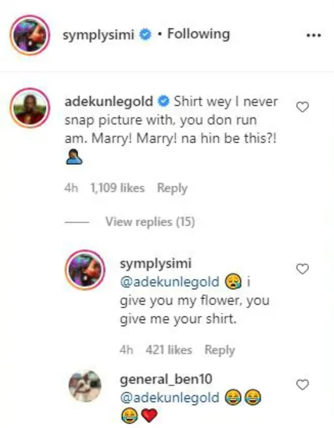 Reacting to the post, her husband, Adekunle Gold taunted her in the comment section by revealing that she shirt she rocked was his, a shirt he’s never worn nor snapped picture with. “Shirt wey I never snap picture with, you don run am. Marry! Marry! na hin be this?!”