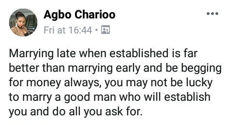 “Marrying late when established is far better than marrying early and be begging for money always, you may not be lucky to marry a good man who will establish you and do all you ask for.”