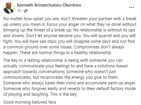 Nollywood actor, Kenneth Okonkwo, has advised people against threatening their partners with breakup during an argument.