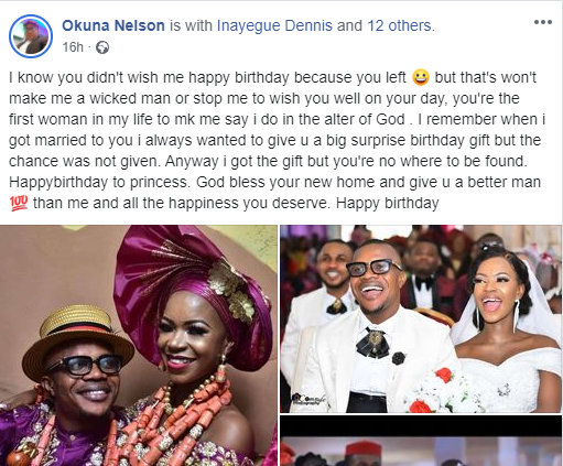 ”I know you didn’t wish me happy birthday because you left but that’s won’t make me a wicked man or stop me to wish you well on your day, you’re the first woman in my life to mk me say i do in the alter of God . I remember when i got married to you i always wanted to give u a big surprise birthday gift but the chance was not given. Anyway i got the gift but you’re no where to be found. Happy birthday to princess. God bless your new home and give u a better man than me and all the happiness you deserve. Happy birthday”