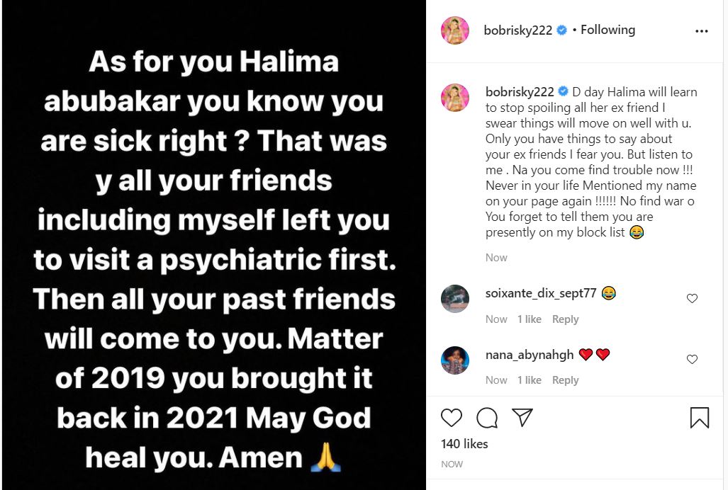 “Halima Abubakar you know you are sick right? that was y all your friends including myself left you to visit a psychiatric first. Then all your past friends will come to you. Matter of 2019 you brought it back in 2021 May god heal you. Amen.