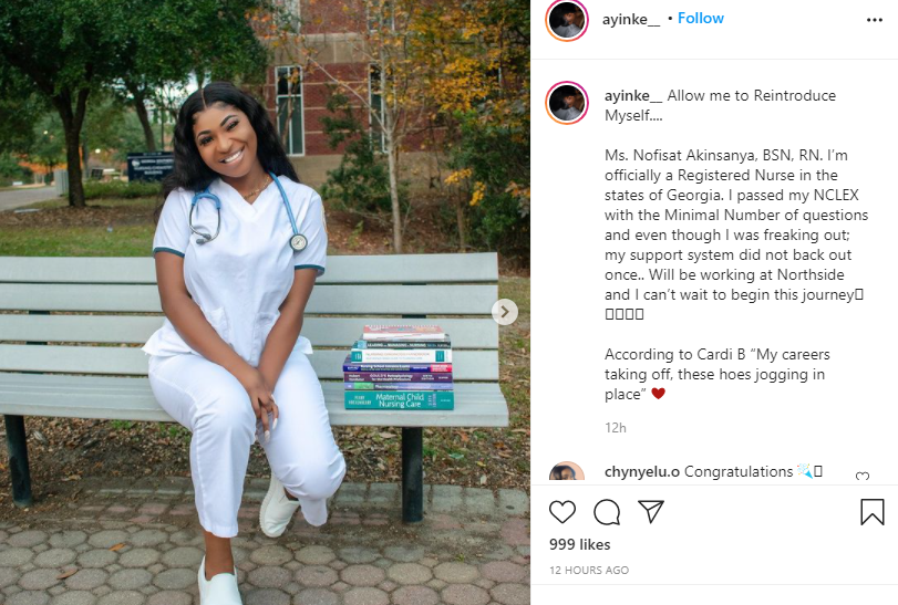 Taking to her Instagram page, the newly registered nurse, wrote;