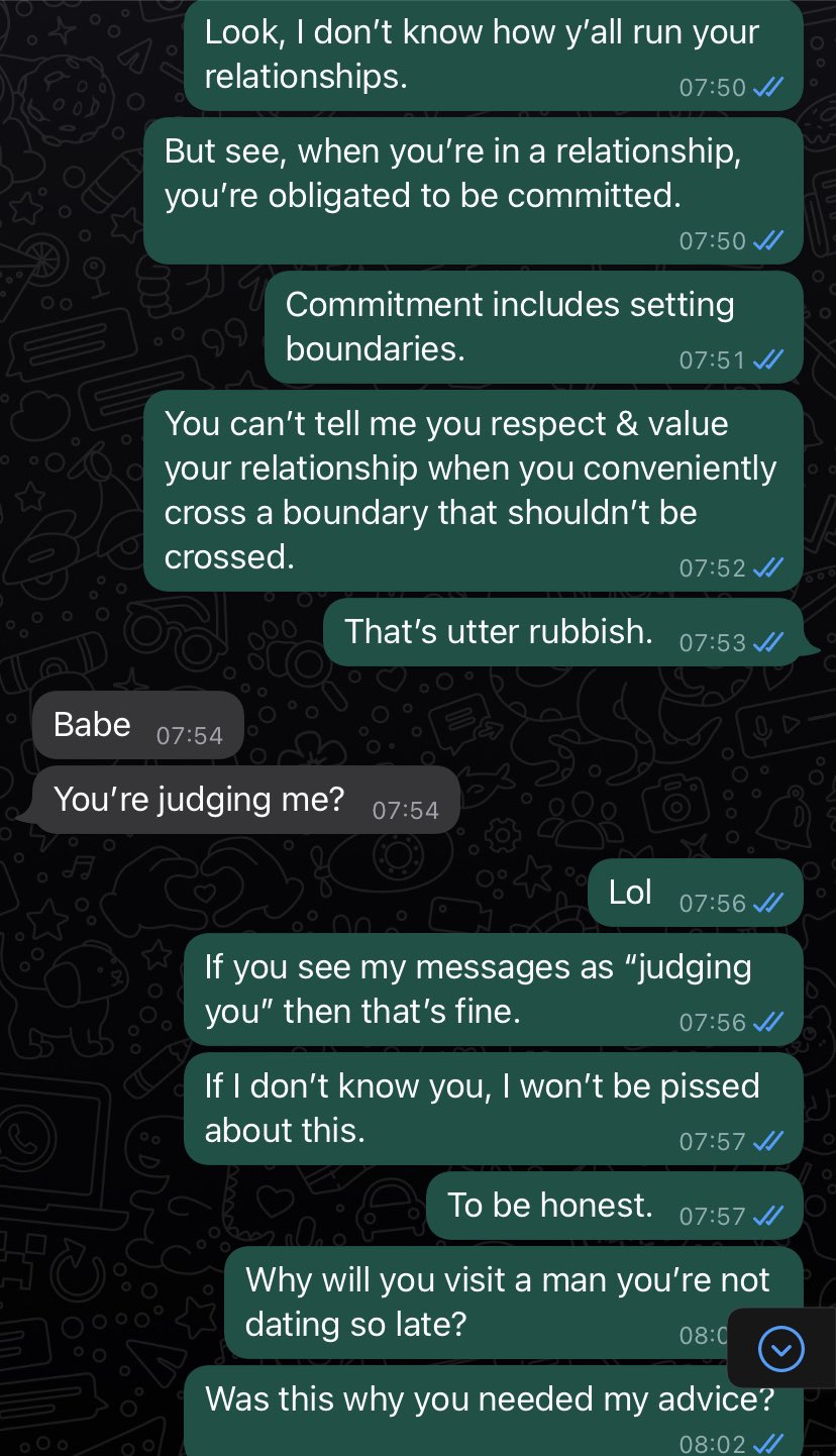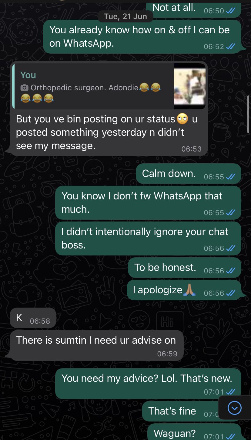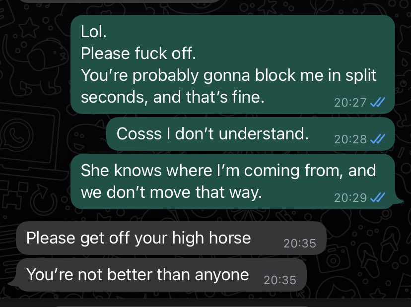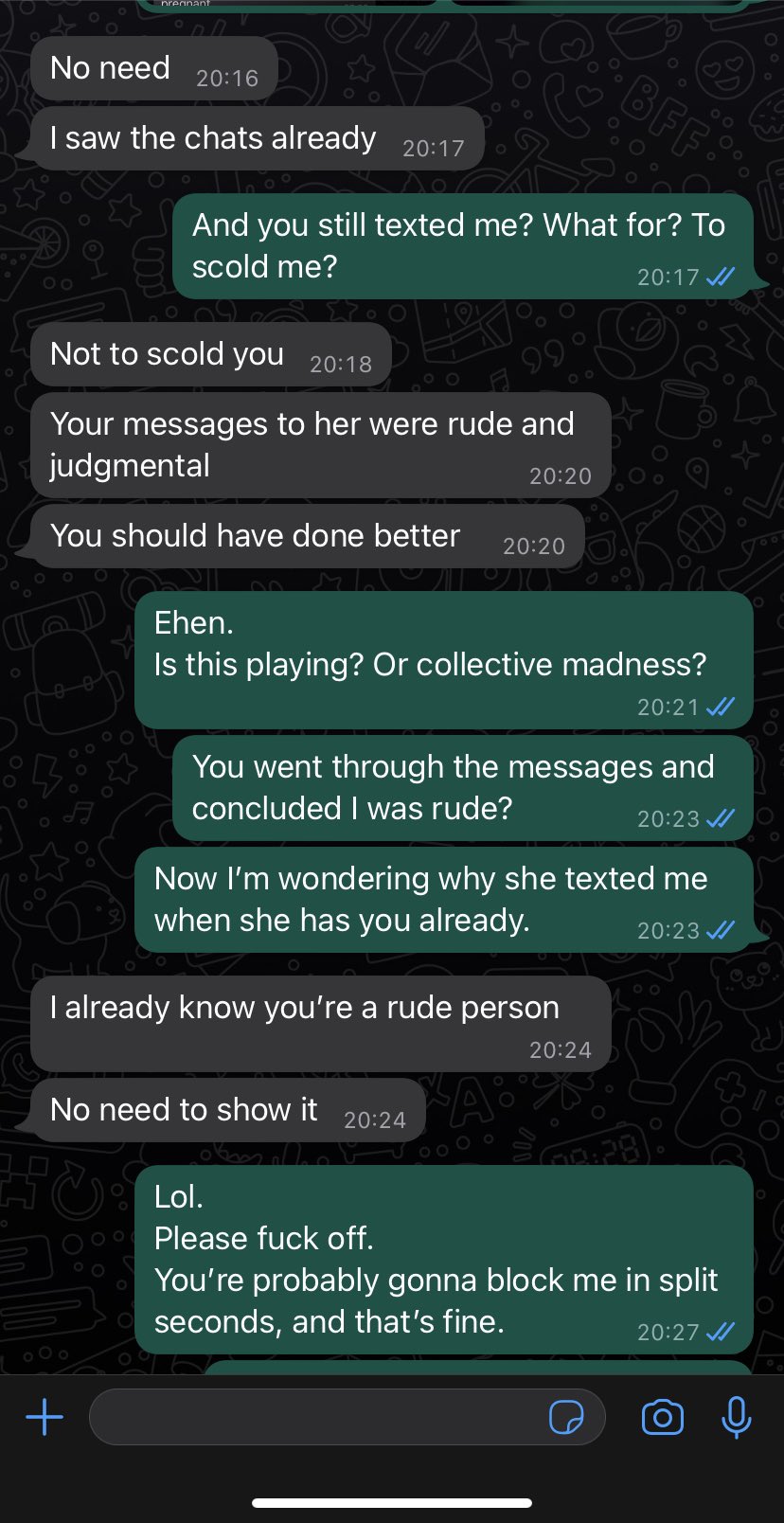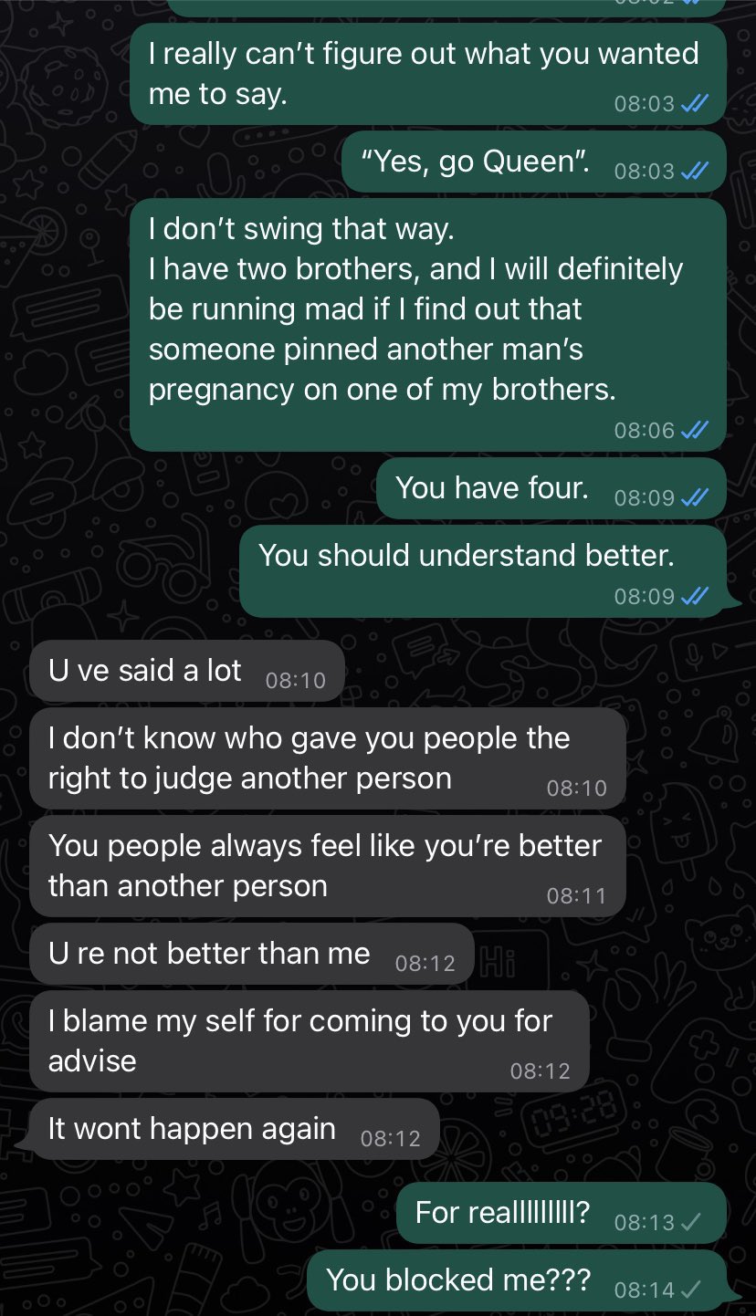 I dropped my 2 cents, you flared up, blocked me everywhere cosss I told you what’s right & wrong. You still had the audacity to mess my name up to people? Why???pleaseee???