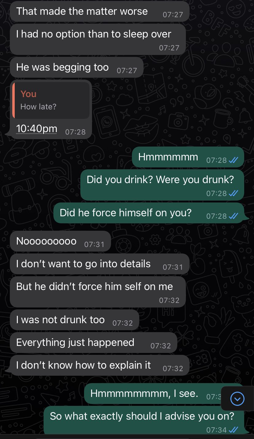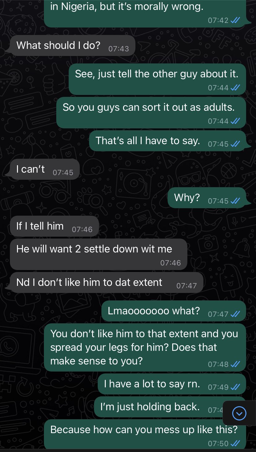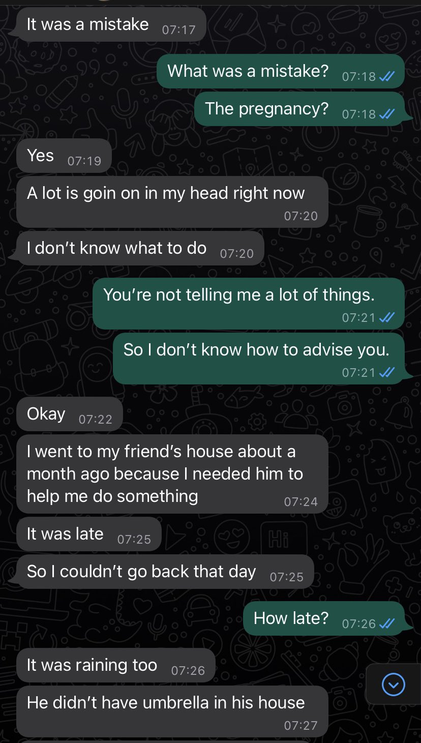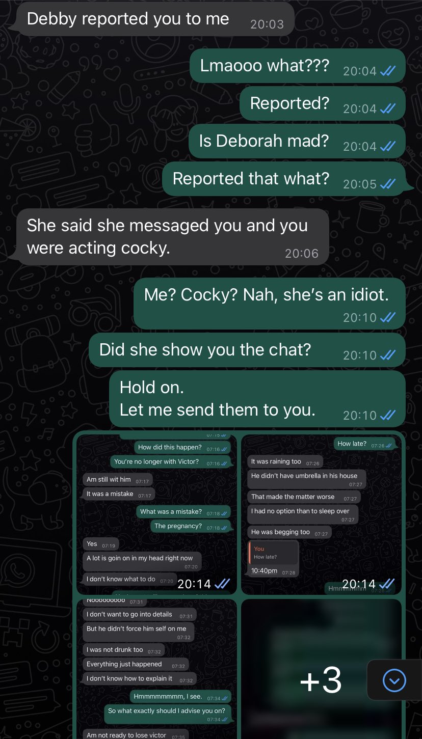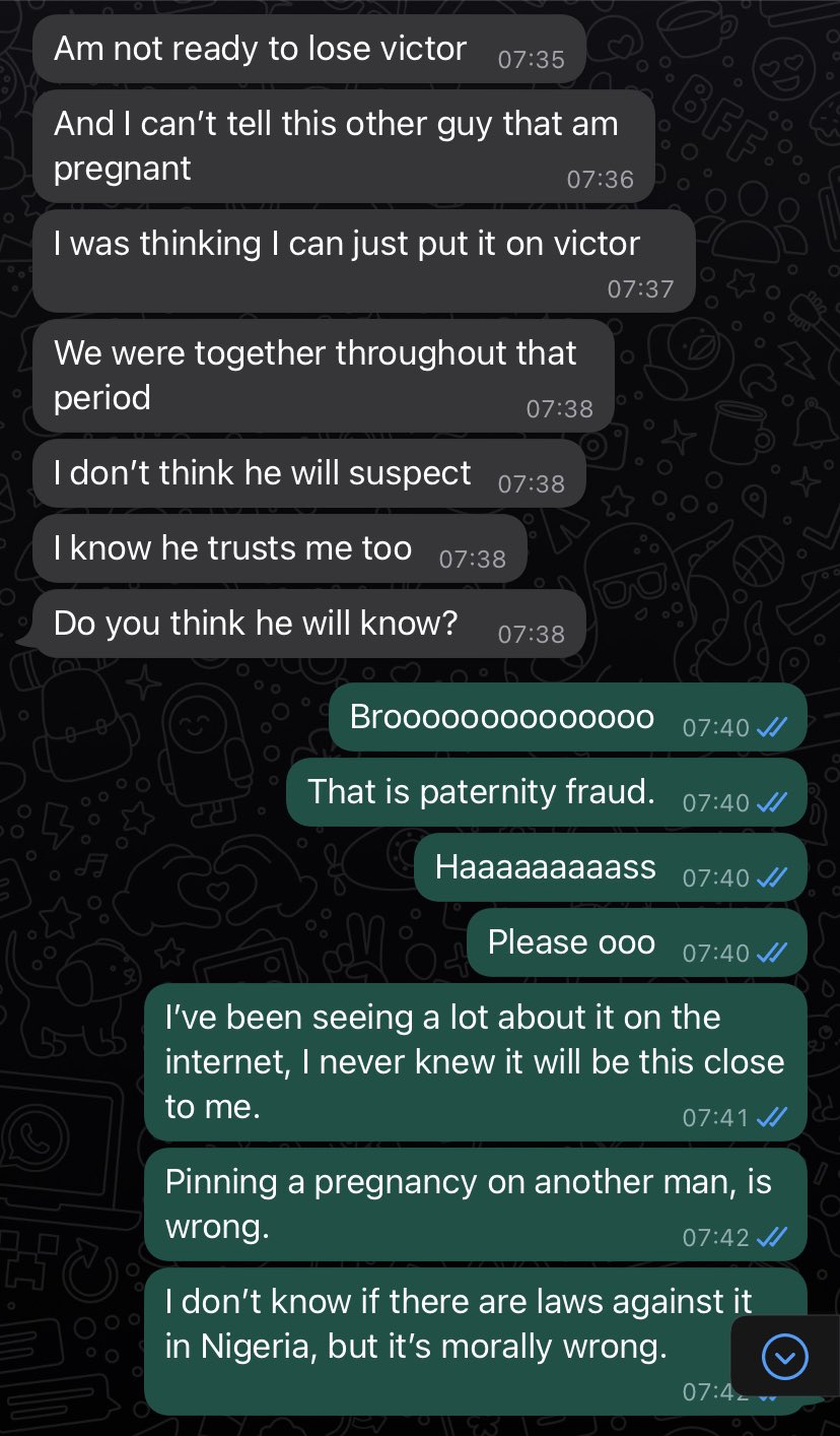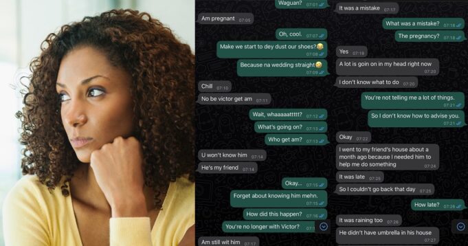 Shugah shared screenshots of her conversation with her friend who had come to her seeking help on what to do. Her friend was engaged to be married to one guy named Victor, but got pregnant for another guy and because she didn’t want to lose Victor, she planned on pinning the pregnancy on him.