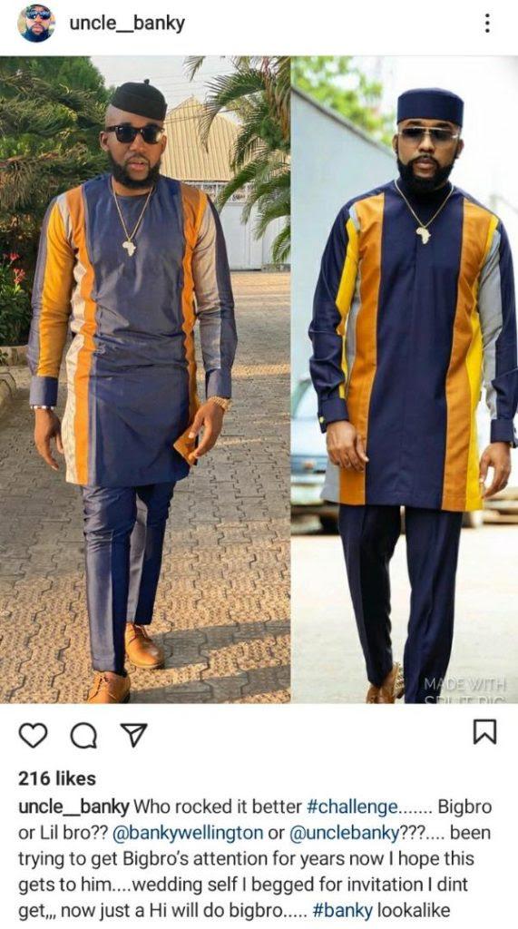 “Who rocked it better #challenge……. Bigbro or Lil bro?? @bankywellington or @unclebanky???…. been trying to get Bigbro’s attention for years now I hope this gets to him….wedding self I begged for invitation I dint get,,, now just a Hi will do bigbro….. #banky lookalike.”