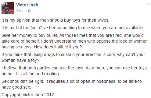 Nigerian life coach on Facebook, Victor Ibeh, has said that in his own opinion, men should buy sex toys for their wives – it should serve as a stand-in for them when they are not available.